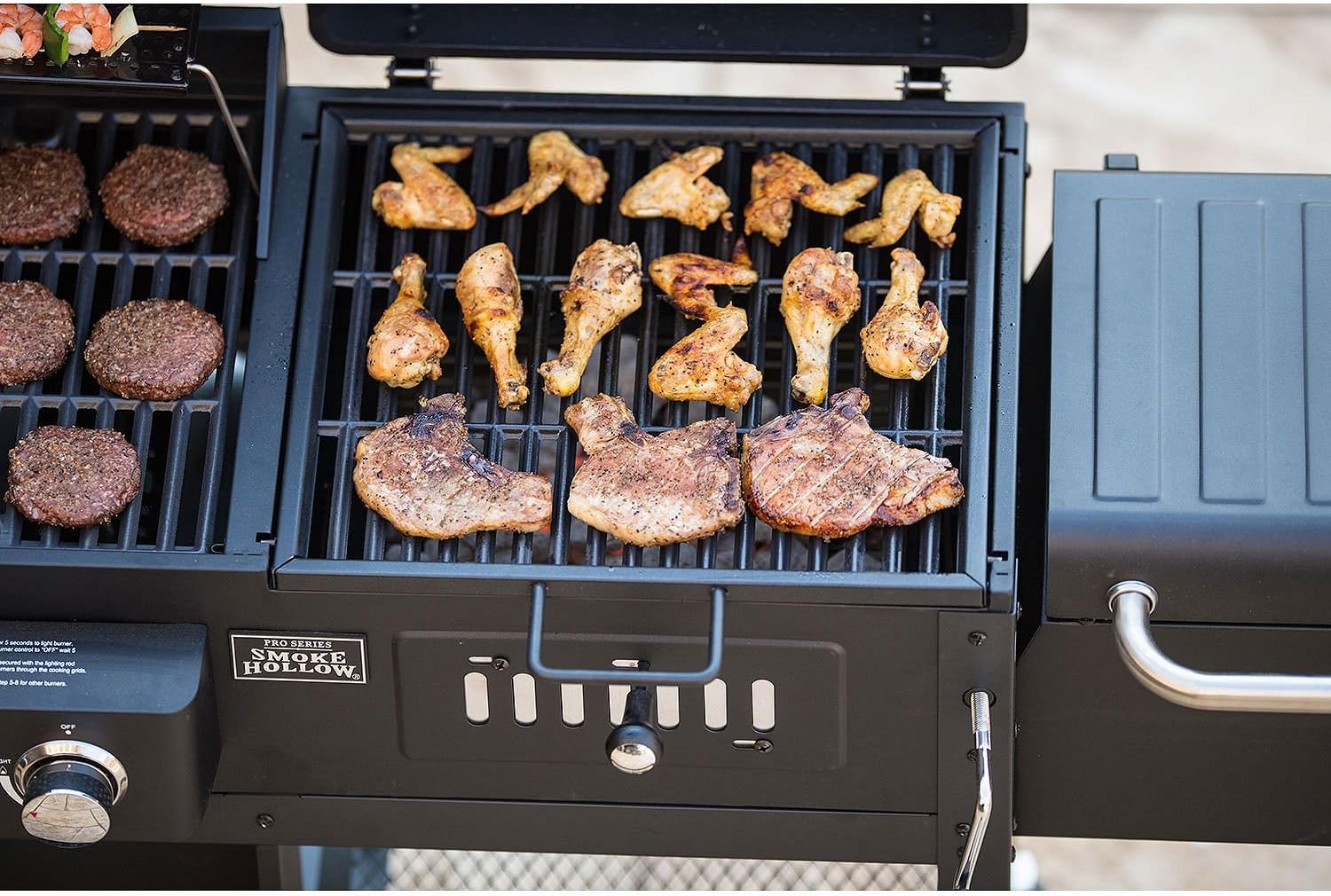 Experience multiple grilling options with the smoke hollow propane and charcoal grill.
